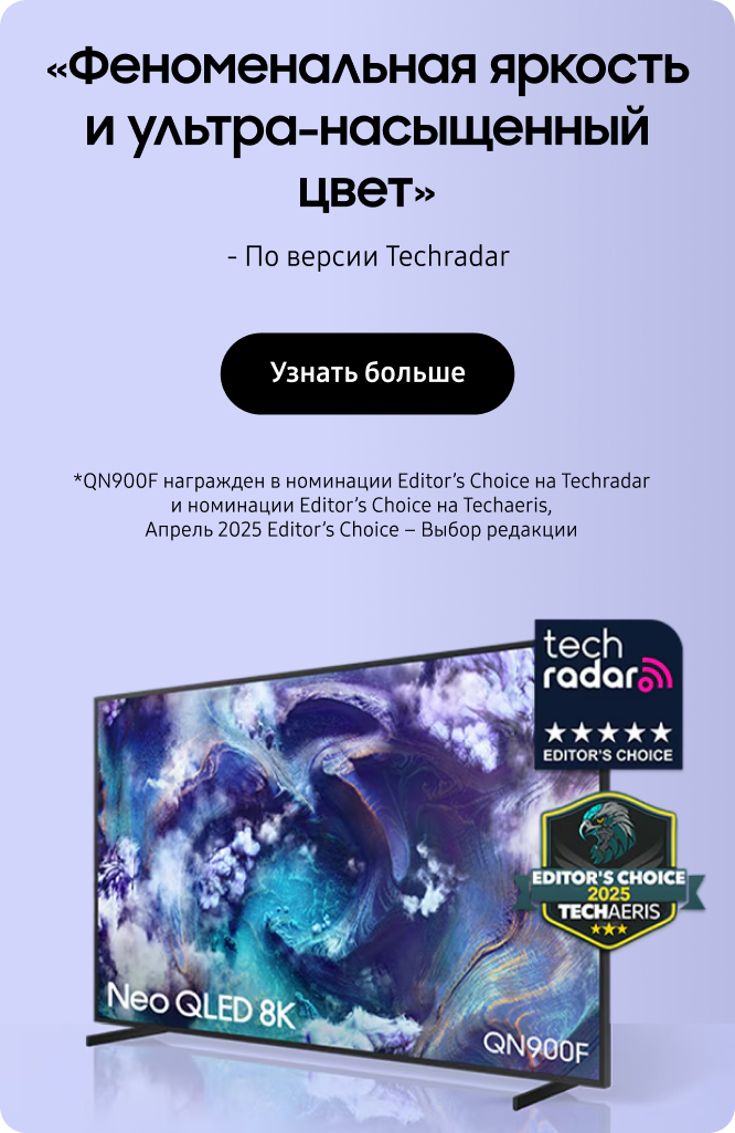 *Изображения смоделированы и предназначены только для иллюстрации. Внешний вид и конструктивные характеристики, не влияющие на работу продукта, могут быть изменены без предварительного уведомления. Интерфейс, содержимое и сервисы могут отличаться в зависимости от региона и могут быть изменены без предварительного уведомления пользователя. *Эффект от просмотра может отличаться в зависимости от типа контента и формата. *Функции могут отличаться в зависимости от модели. Для получения дополнительных подробностей уточняйте спецификацию каждой модели. *Телевизор №1 в мире (Global No.1 TV): Источник - Omdia, февраль 2025 г.. Результаты не являются рекламной кампанией Samsung. Использование ссылок на результаты возможно только на собственный страх и риск.