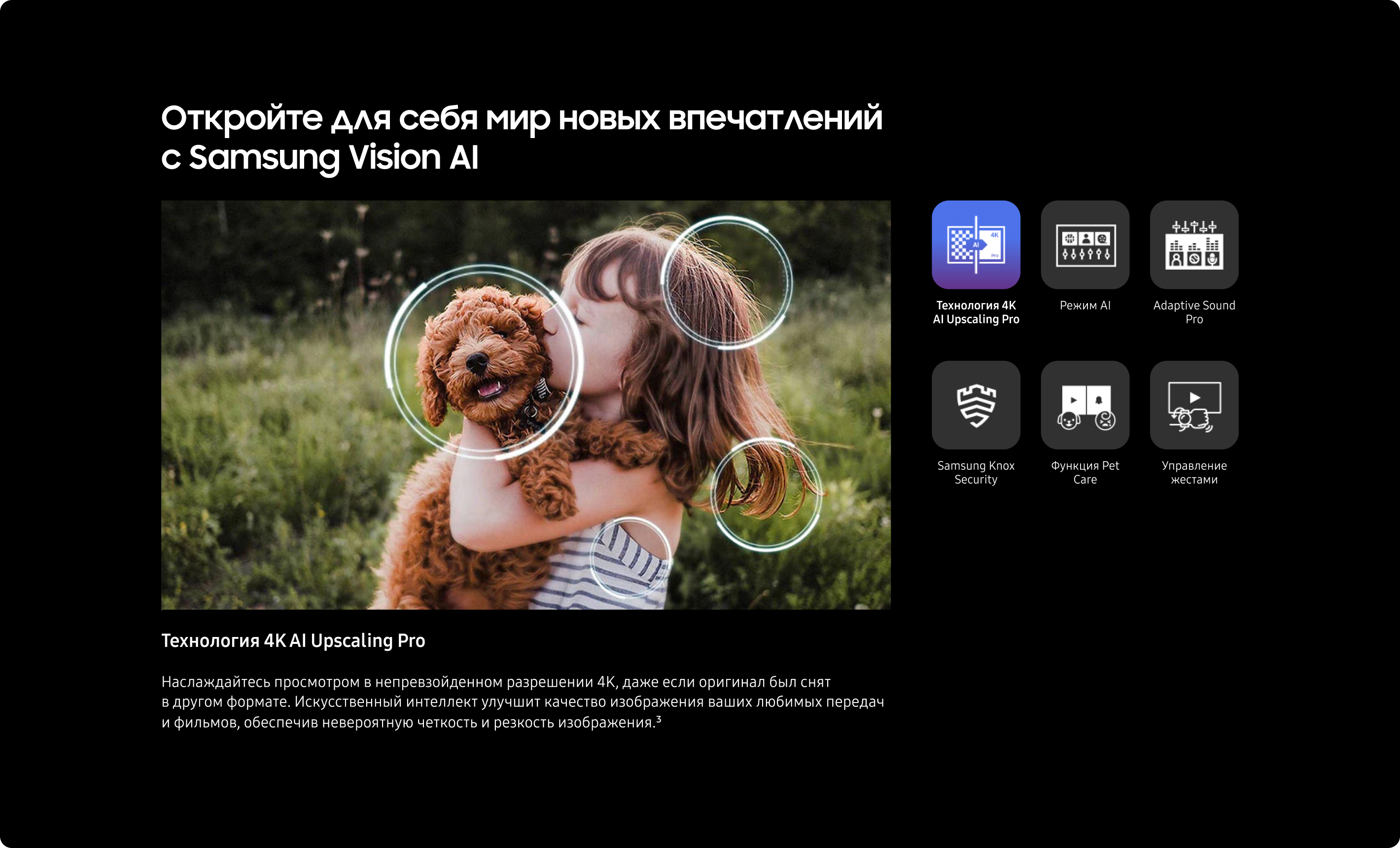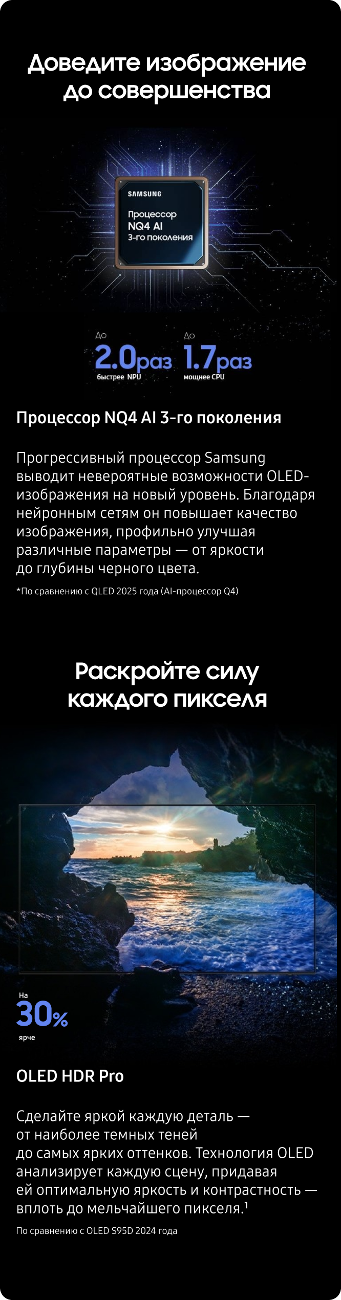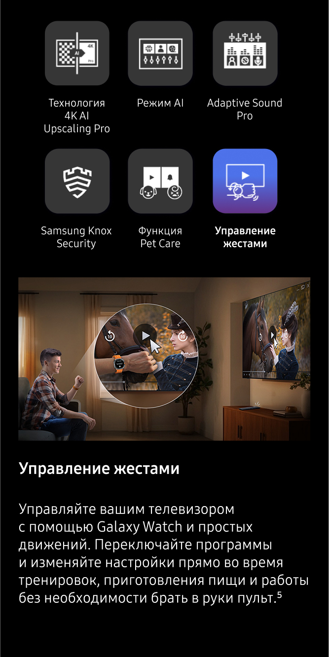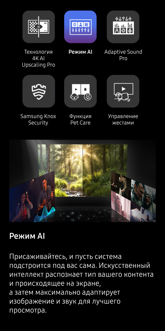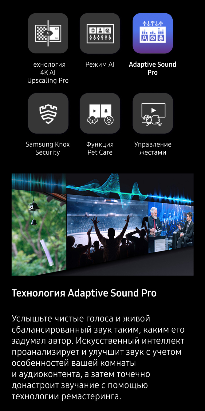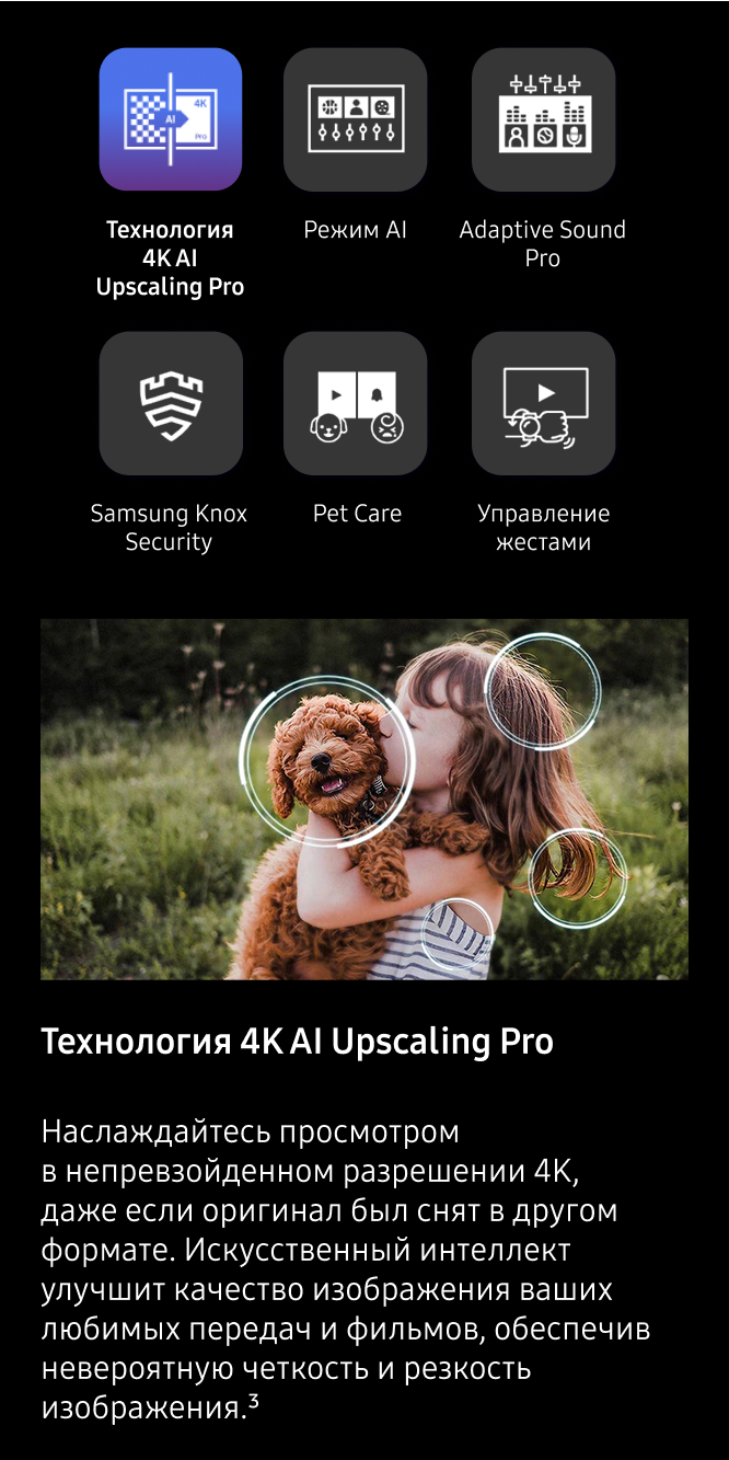 2. Технология 8K AI Upscaling Pro: эффект от просмотра может отличаться в зависимости от типа контента и формата. 8K AI Upscaling может не применяться при подключении к ПК и в игровом режиме.