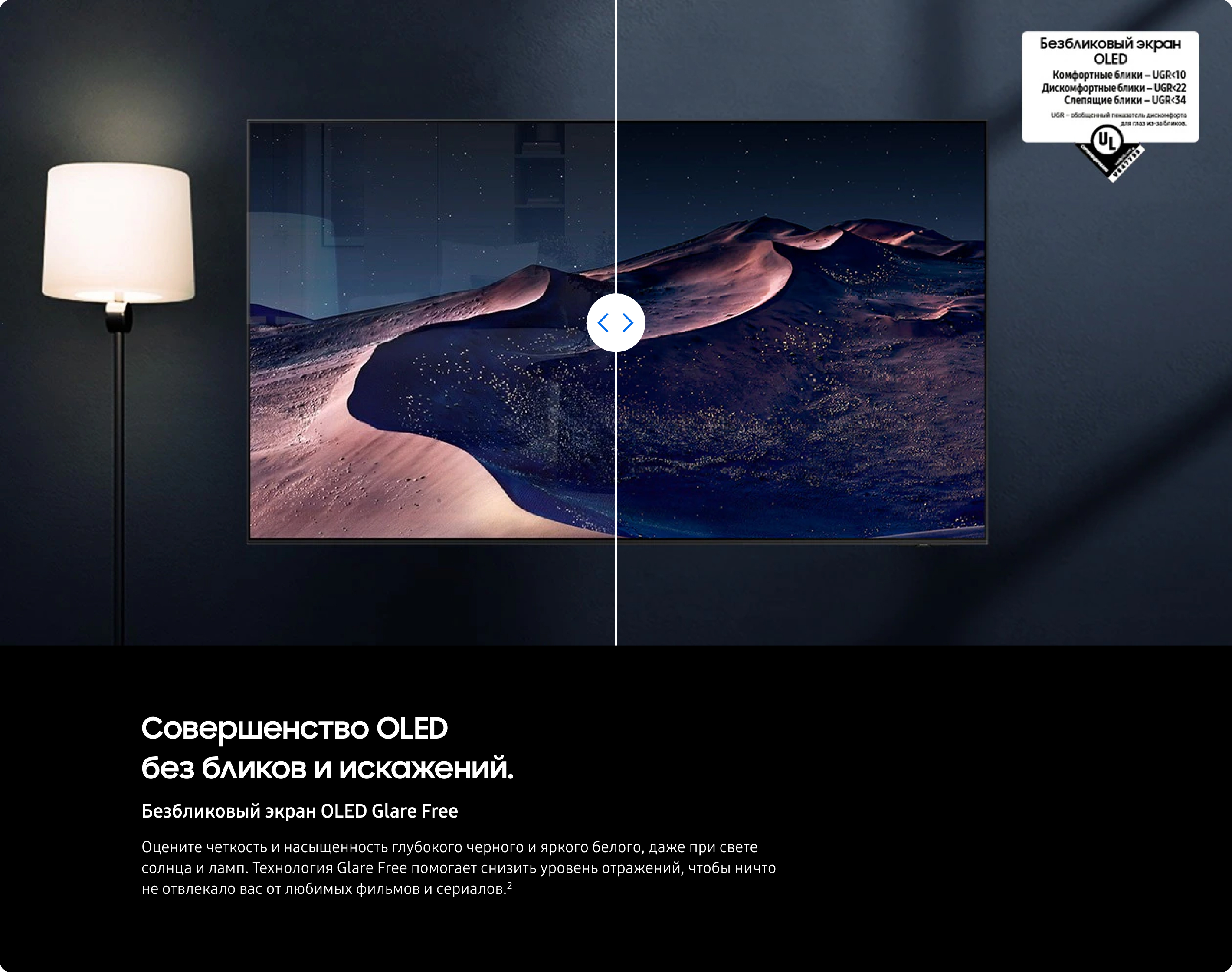 8.Технология отсутствия бликов Glare Free: Проверка Underwriter Laboratories подтверждает заявленное свойство «Отсутствие бликов» на основе оценки по стандарту UGR (Unified Glare Rating), установленному Международной комиссией по освещению (CIE), а также по стандартам Международной организации по стандартизации (ISO). Результаты основаны на испытаниях в условиях освещения в помещении.