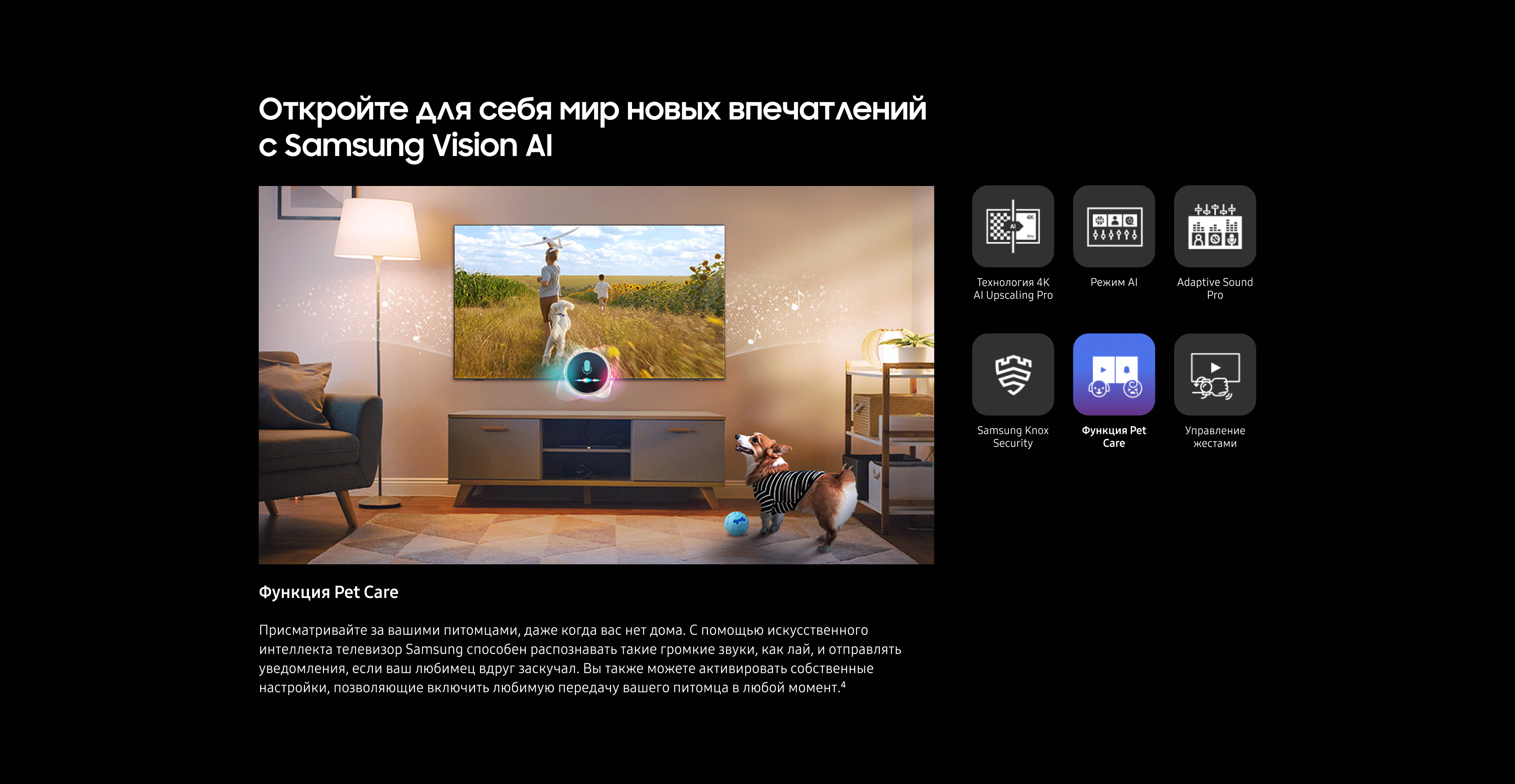 5. Забота о питомце: Потоковая передача в реальном времени на мобильные устройства поддерживается на мобильных устройствах с ОС Android 11.0 и более поздних версий или iOS 16.0 и более поздних версий, а также на телевизорах Samsung, выпущенных в 2025 году и позднее. Функция работает только при выключенном телевизоре. Для использования этой функции телевизор должен быть подключен к источнику питания. Телевизор и мобильное устройство должны быть подключены к SmartThings через одну и ту же учетную запись Samsung Account, чтобы отправлять и получать уведомления.