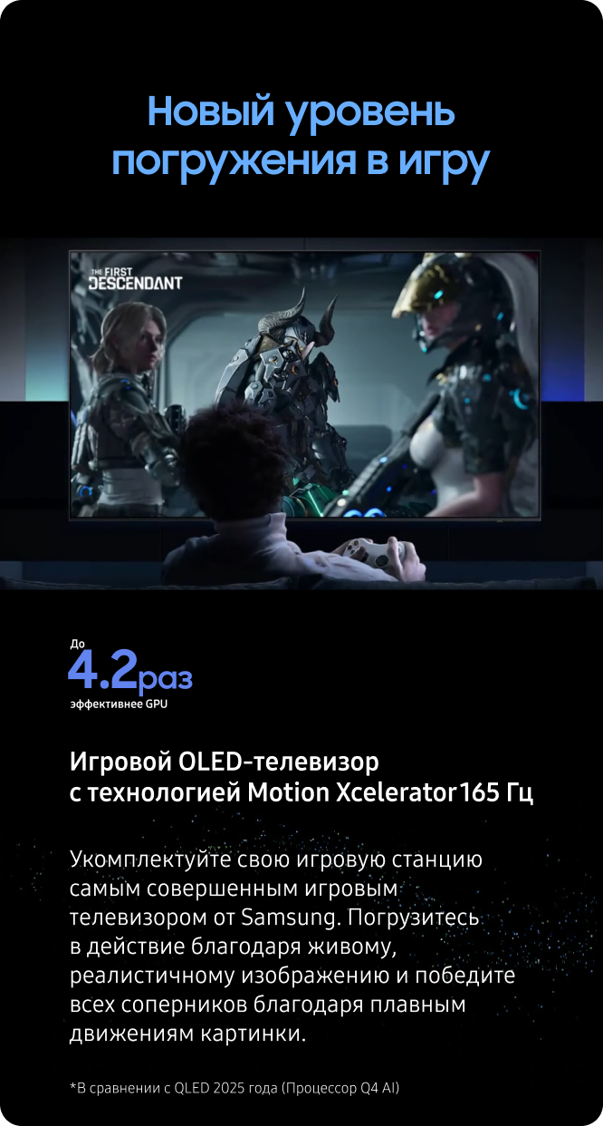 *Доступность контента и сервисов зависят от региона и это может меняться без предварительного уведомления пользователей. Перед использованием нужно принять Положения и условия сервиса Smart Hub, а также Политику конфиденциальности. Некоторые материалы и сервисы требуют регистрации и подписки.Требуется учетная запис Samsung.Обновление ОС Tizen будет поддерживаться до 7 лет, начиная с 2025 года для продуктов, выпущенных в 2025 году. Следует заметить, что обновление не распространяется на рабочие характеристики телевизора, функции или долговечность.